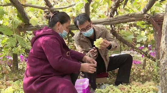 余渔(右)帮农民采摘葡萄。图片来源:中国青年报