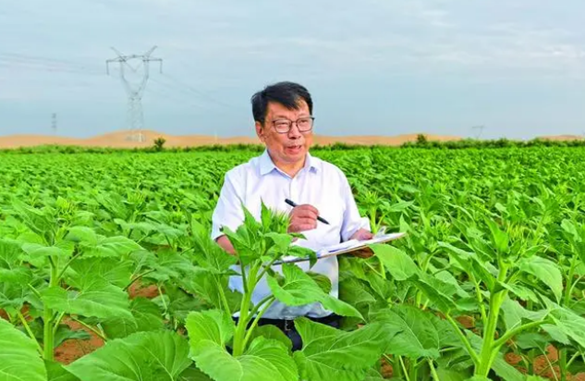 易志坚在乌兰布和试验基地的葵花种植地块查看和记录葵花长势。图片来源:新华社
