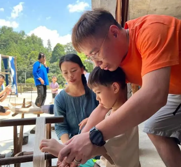 小朋友和家长一起体验侗族土布的织布技艺。图片来源:多彩贵州网