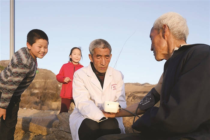张尚保(中)为村民量血压(图片来源:黄河新闻网)