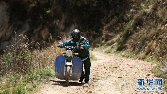 桑南才推着摩托车行走在邮路上。图片来源:新华社