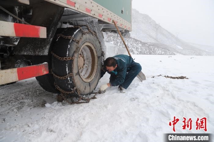 大雪中,杨全忠正在拆装邮车的防滑链条。图片来源:中新网
