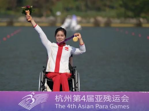 10月23日上午,在杭州富阳水上运动中心赛场,谢毛三在皮划艇女子KL1级决赛中,以55.478秒的成绩斩获金牌,这是中国代表团本届亚残运会获得的首金。同时,这也是皮划艇项目首次亮相亚残运会,这意味着谢毛三代表中国队,拿下了亚残运会皮划艇项目的历史第一金。