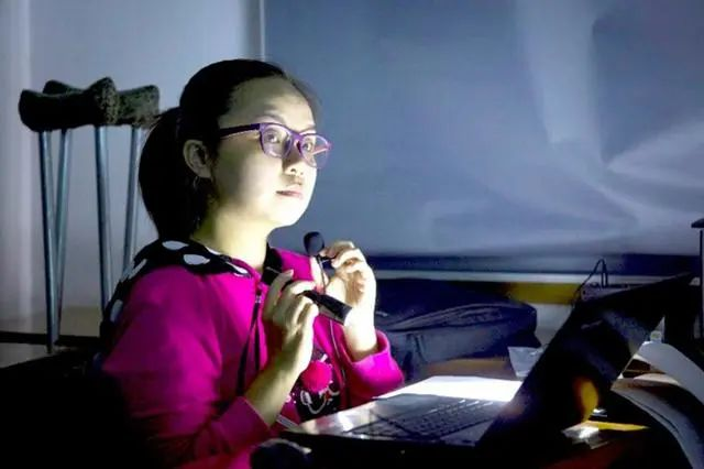 为盲人朋友们讲电影时的杜诚诚。图片来源:中国残疾人联合会