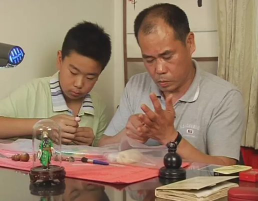郎佳子彧(左)和父亲郎志春(右)学习面塑技艺(图片来源:央视网)
