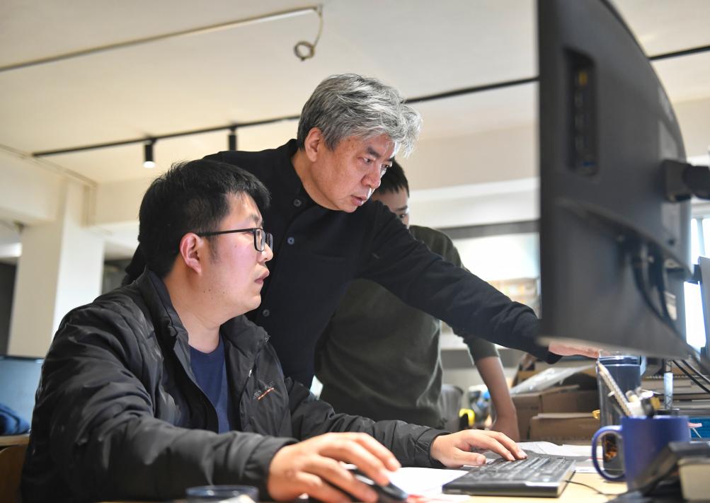 刘家琨(左二)与同事商讨设计方案。新华社记者 刘坤 摄